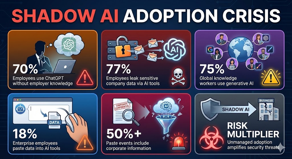 In conference rooms and cubicles across corporate America, a quiet security crisis is unfolding. Approximately 70% of employees who use ChatGPT and other AI tools do so without informing their managers or bosses (1), creating what security experts call “shadow AI” — the unauthorized use of personal AI accounts for work tasks.