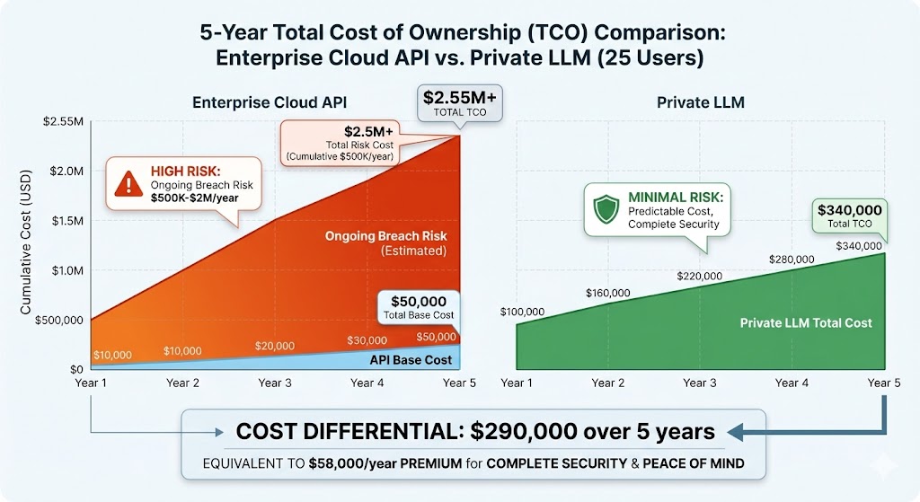 The math is straightforward. A comprehensive private LLM solution costing $150,000-400,000 annually provides complete data security, regulatory compliance, predictable costs, and peace of mind.