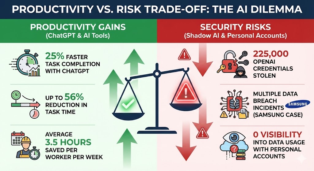 The rapid, uncontrolled spread isn’t surprising. Research from Harvard, MIT, and BCG finds that consultants using ChatGPT complete tasks up to 25% faster than those who do not use AI, with some studies showing task time dropping by as much as 56% (4). When productivity gains are this significant, employees naturally gravitate toward these tools — with or without corporate approval.